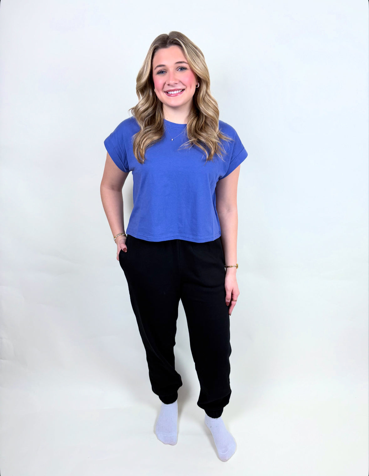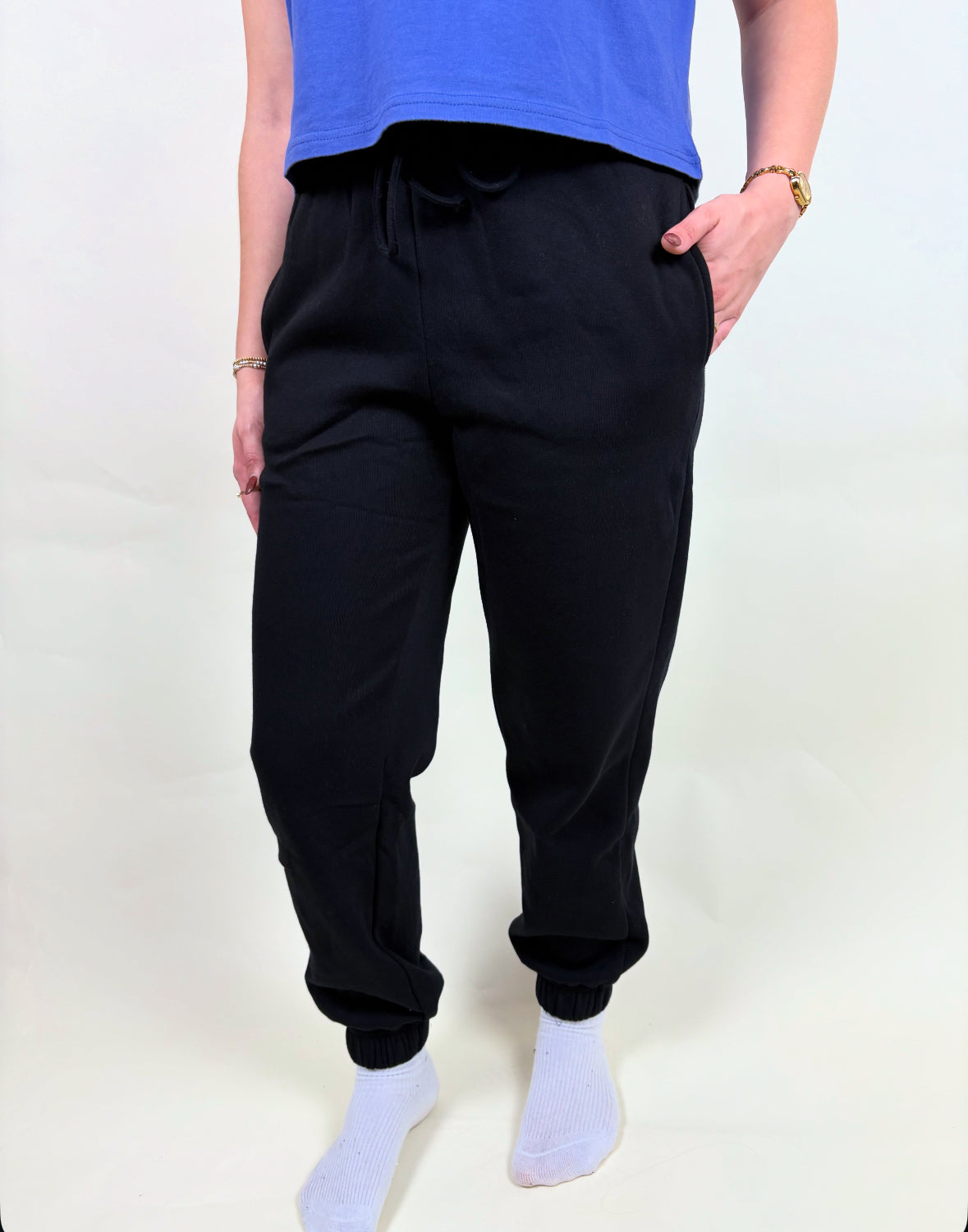 - TTS Fitted Jogger, recommended going up a size for a more lounging, comfy fit! Model is 5’3 wearing a medium!