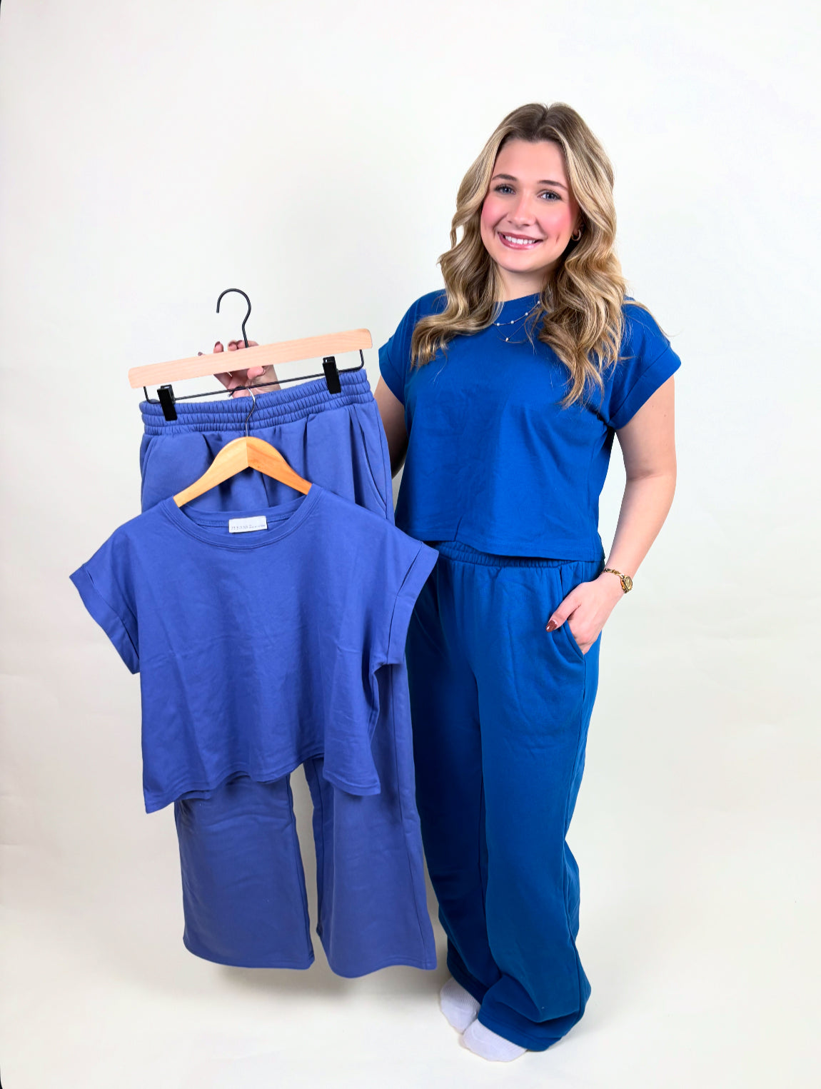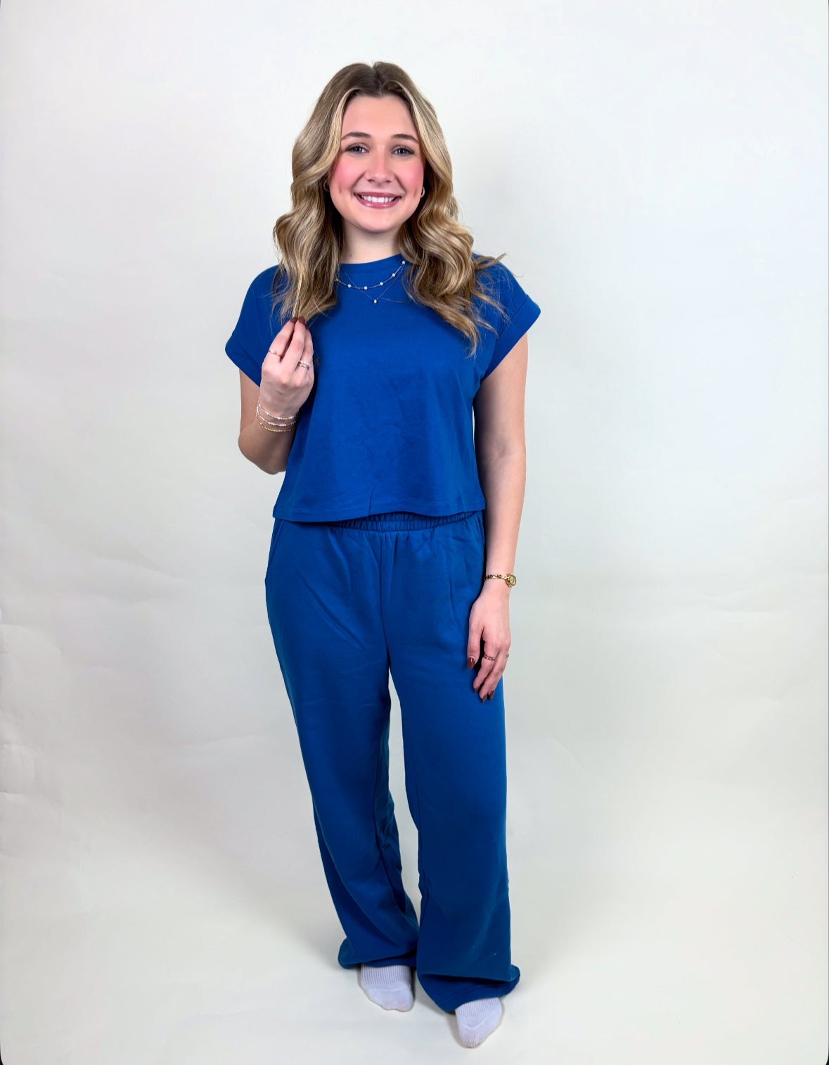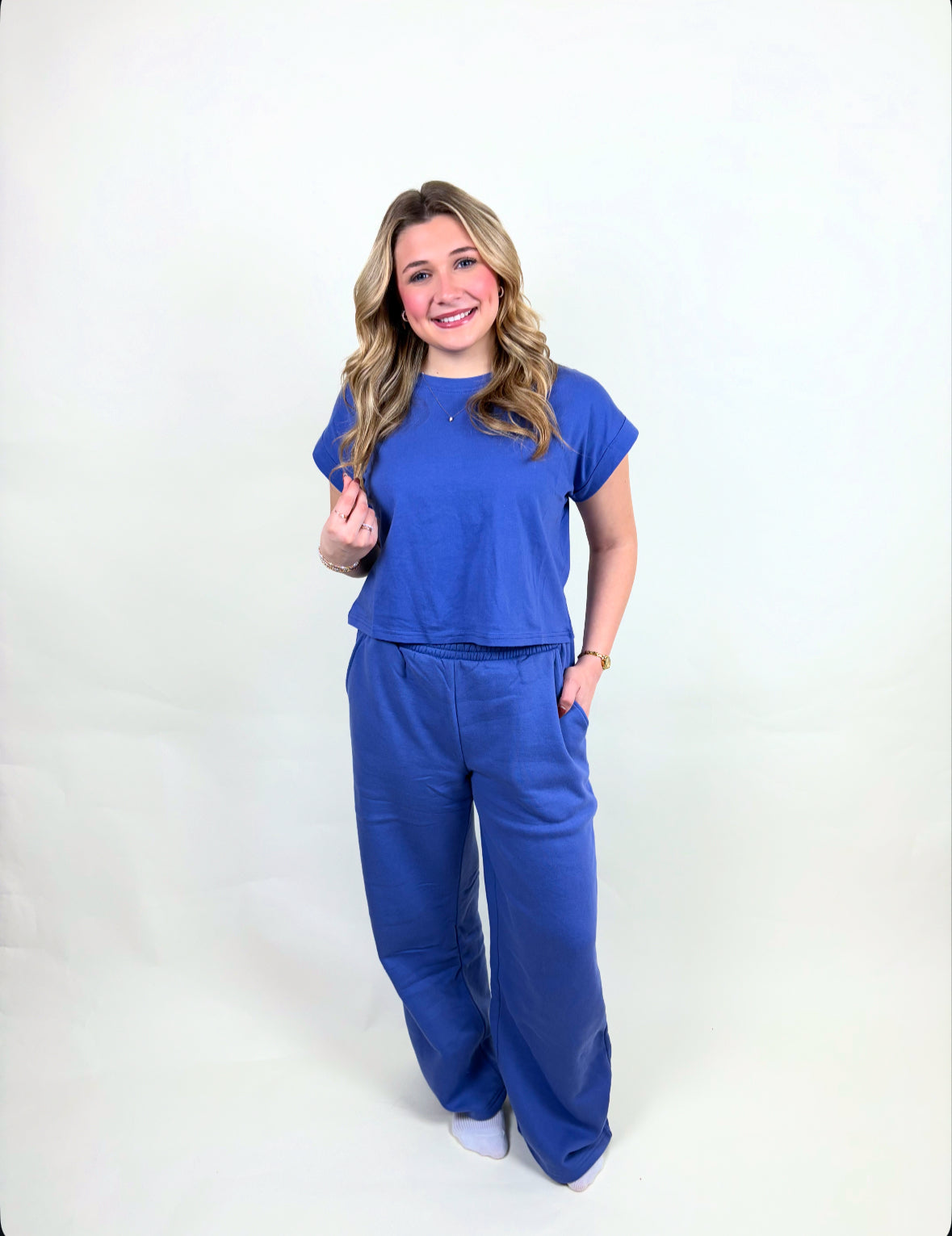 These fleece pants paired with its folded sleeve cotton tee makes the dreamiest set!! An easy outfit choice for everyday!! Top: 100% cotton, cropped, folded sleeve detail. Pants: 60% cotton, 40% polyester, high waisted, with elastic waist band and pockets.