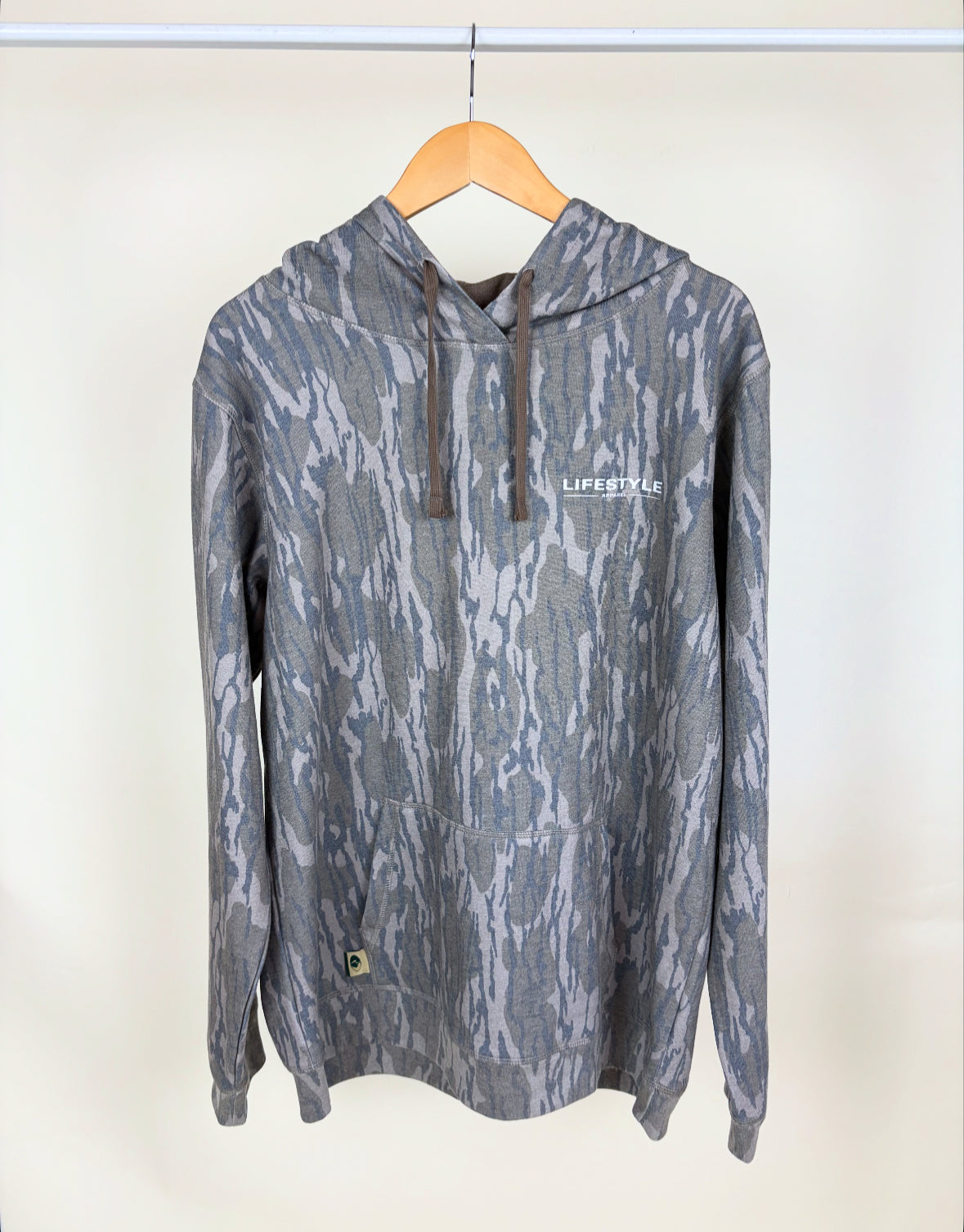 Mossy Oak Washed Out Bottomland Tri-Blend Hoodie. Unisex fit, 50% polyester, 25% cotton, 25% rayon