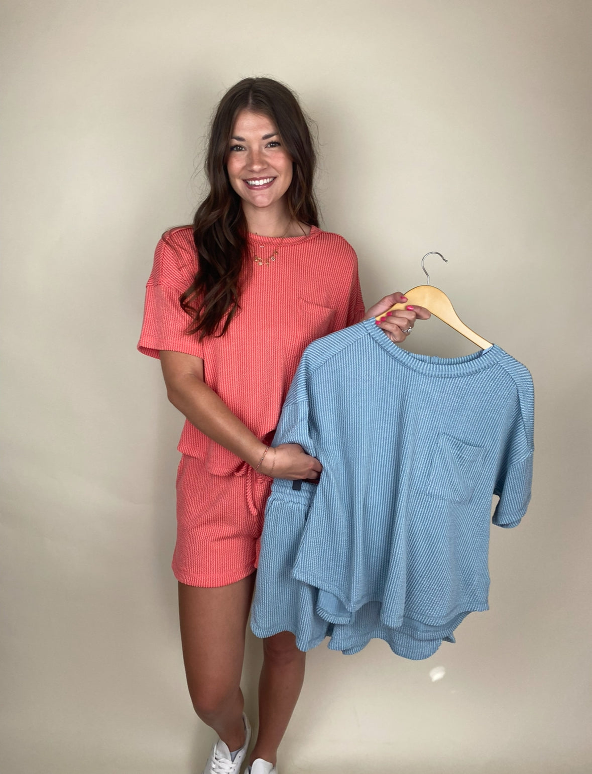 This set is made of the most comfortable, stretchy material and it has the cutest details! From the pocket in the front to the buttons down the back on the top, and it’s drawstring shorts with pockets it’s perfect for everyday!!
